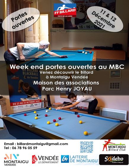 PORTES OUVERTES AU MONTAIGU BILLARD CLUB Les 11 et 12 décembre 2021, le MBC à organisé son week-end portes ouvertes au club Une vidéo informant sur cette manifestation a été diffusé sur les écrans de la commune de Montaigu - Vendée la semaine précédant ce week-end