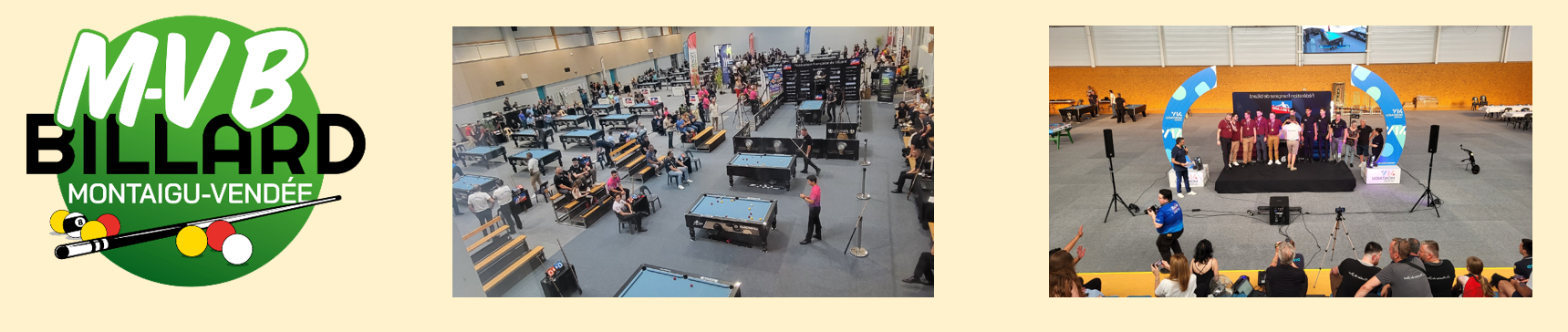 LE MBC DEVIENT LE M-V BILLARD Lors de l'Assemblée générale du 7 septembre 2024, les membres ont validé le changement de dénomination de notre club. Le Montaigu Billard Club (MBC) devient le Montaigu-Vendée Billard (M-V B). Ceci pour s'adapter à notre nouvelle commune de MONTAIGU-VENDEE A cette occasion un nouveau logo remplacera le logo précédent pour donner une image plus moderne et pour associer la discipline Blackball en place au club depuis 2014. Un nouveau dépliant de présentation du club a également été créé.Les polos du club vont être renouvelés pour inclure ce nouveau logo et seront mis en service pour la nouvelle saison