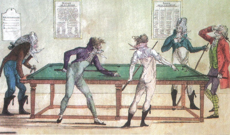 XIX ème siècle : En 1823, le procédé en cuir « partie de la queue en contact avec la bille » est créé par le capitaine Mingaud. La queue, après être frottée sur une craie permet d'améliorer de façon importante l'adhérence à la bille et d'éviter le glissement sur la bille. Le joueur peut alors frapper la bille sur toute sa zone. Les effets, le rétro, le massé sont alors découverts pour donner des directions jusqu'alors inconnues à la bille. Le billard carambole va se développer et le XIX ème siècle verra la création de nombreuses académies de billard en Europe. Les nombreuses compétitions font apparaître de grands champions et championnes. Venu d'Angleterre, le billard à poches ou billard pool avec ses 15 billes et ses 6 blouses (qui deviendront les poches) se développe dans les cafés. |
